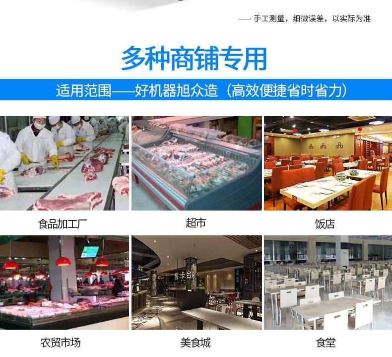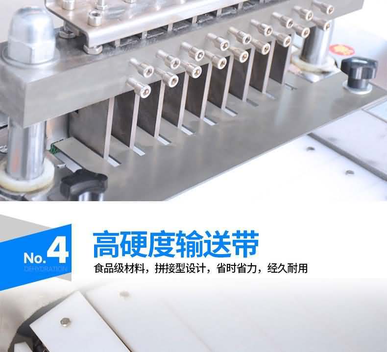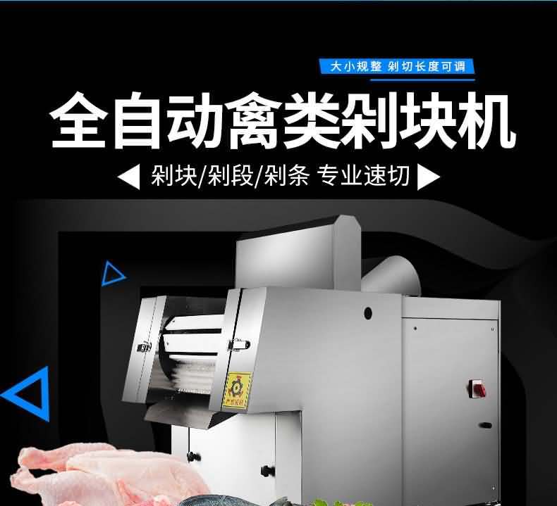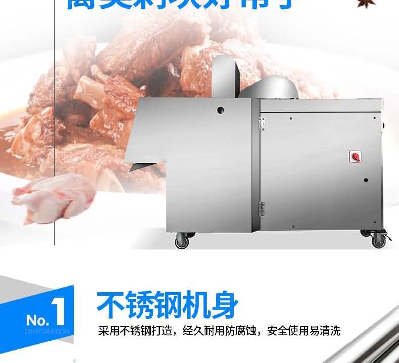 本機(jī)性?xún)r(jià)比高,模擬以手工切斷,切塊的原理采用“變速機(jī)構(gòu),自動(dòng)送料”的結(jié)構(gòu)研制而成。無(wú)損耗,采用特殊刀具刀塊,自動(dòng)加厚履帶輸送,避免了切塊的危險(xiǎn)性,使用安全性較高,切斷過(guò)程中不產(chǎn)生廢料,很大程度的保護(hù)了您的利益,節(jié)省人工,一機(jī)可抵多人工作,每小時(shí)可剁切600公斤,大大提高生產(chǎn)效率。廣泛用于大中小型食品加工廠、集體食堂、屠宰場(chǎng)、肉聯(lián)加工廠、超市等。適用于雞肉、鴨肉、魚(yú),中小型動(dòng)物骨頭、冷凍肉、鮮肉、凍雞、雞腿等帶骨肉類(lèi),可根據(jù)需要剁塊、段、條等,大小可調(diào)。