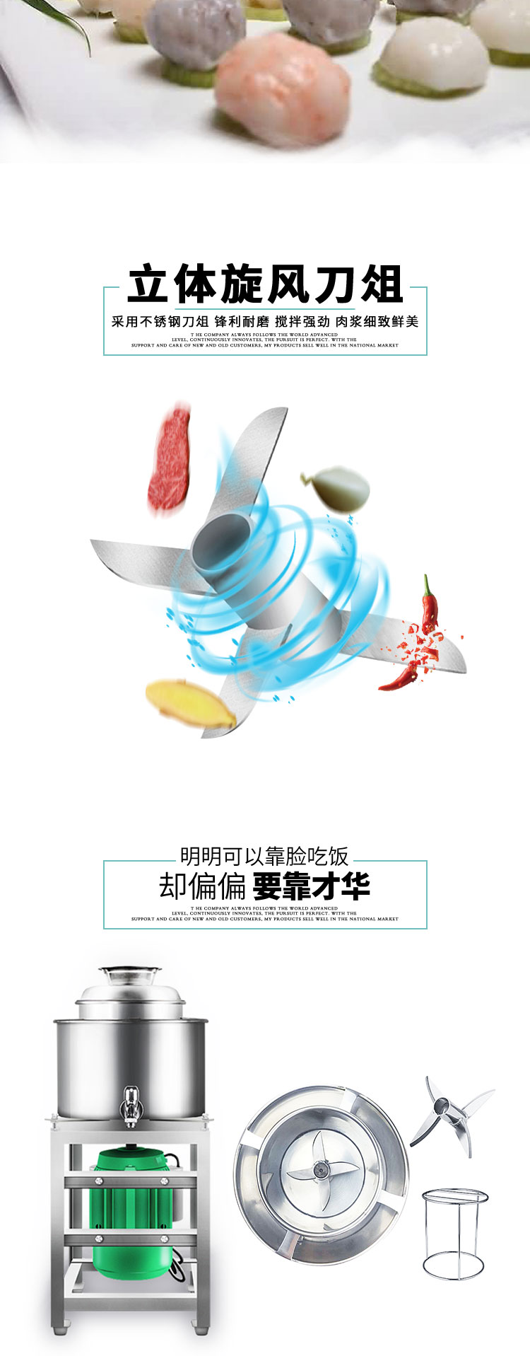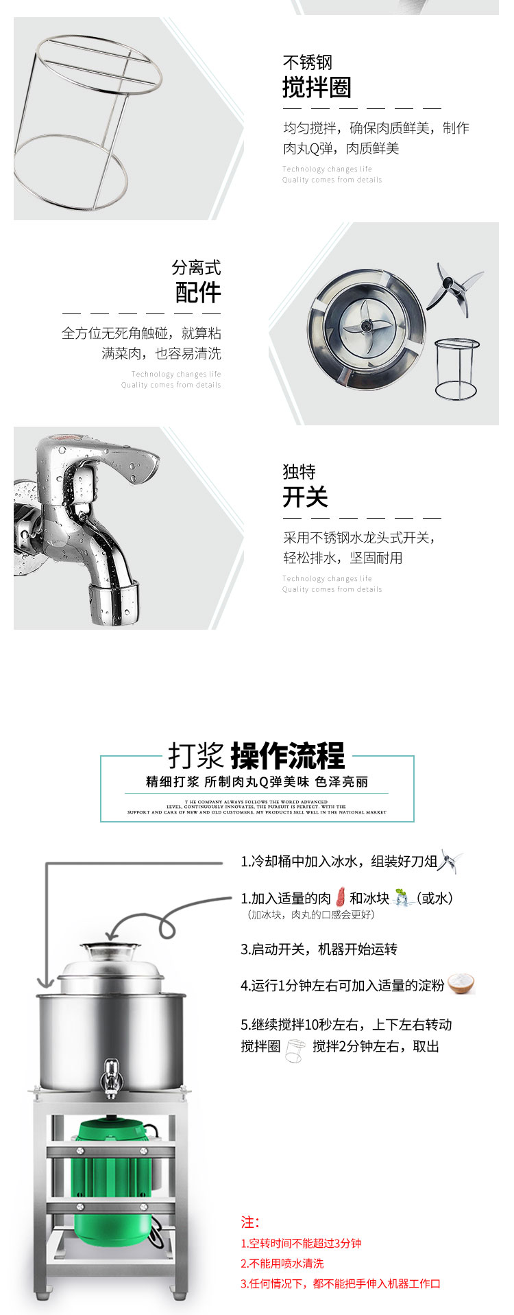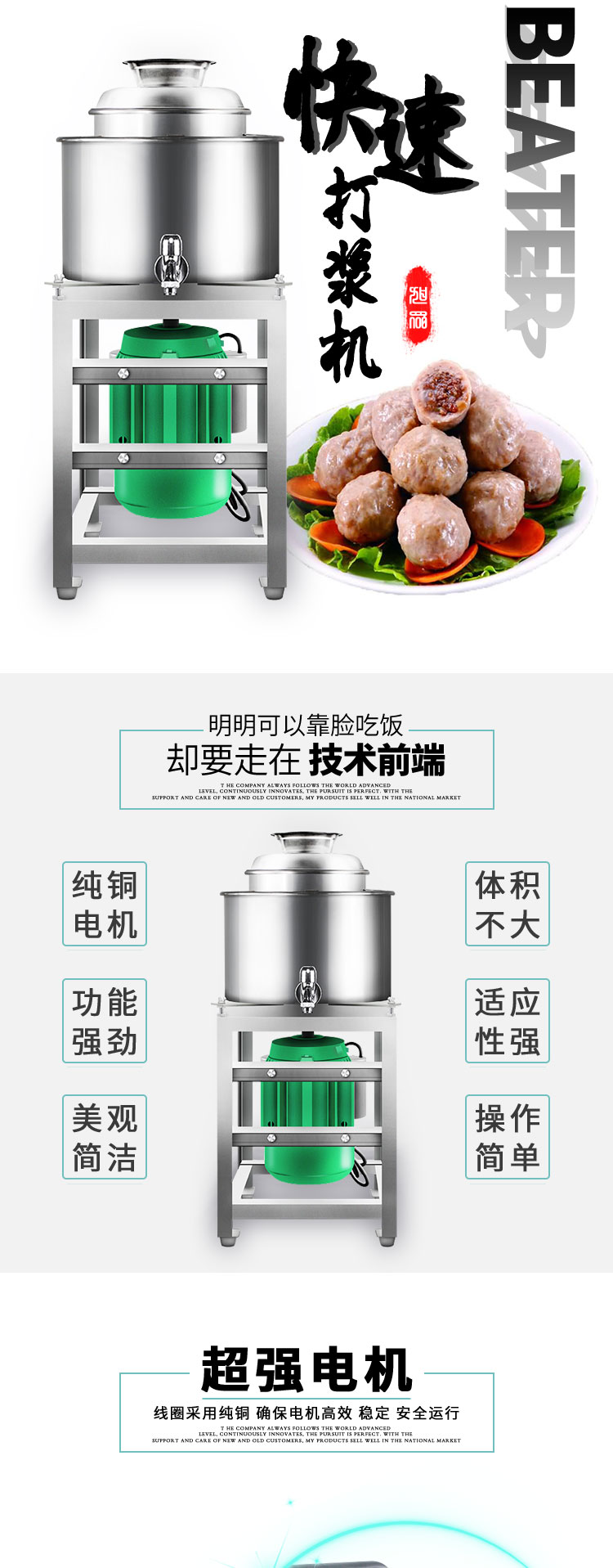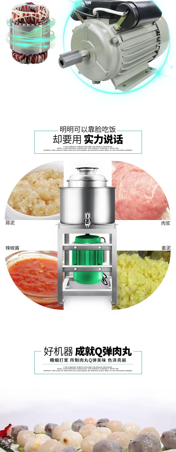 本產(chǎn)品一次裝肉量為2-8斤(大、中、小型)。開機(jī)2-3分鐘即可完成打肉、配料、攪拌成漿,比手工錘打的肉漿精細(xì),所產(chǎn)肉丸、魚丸彈性好,色澤潔白。