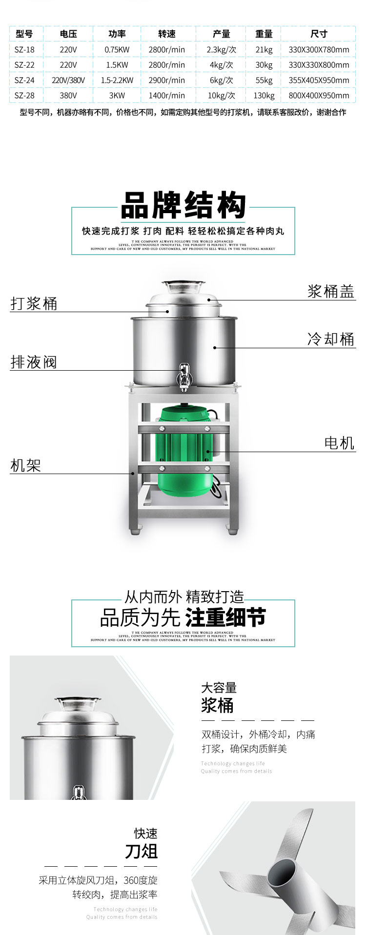 快速打漿機(jī)XZ-18, XZ-22, XZ-25是結(jié)合國內(nèi)實(shí)際情況研制而成,具有美觀大方、不銹鋼料筒、不銹鋼支架,堅(jiān)固耐用、操作維修方便、高效省電等特點(diǎn)。是加工豬肉丸、牛肉丸、魚丸之理想設(shè)備自問世以來受用戶歡迎。