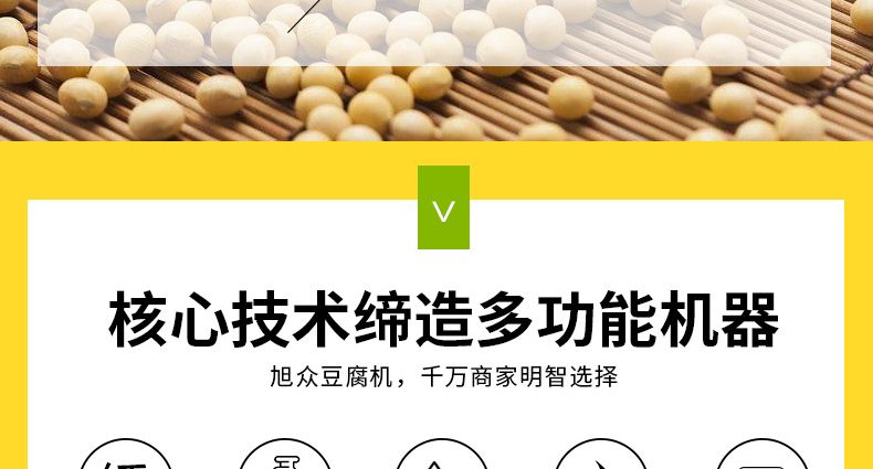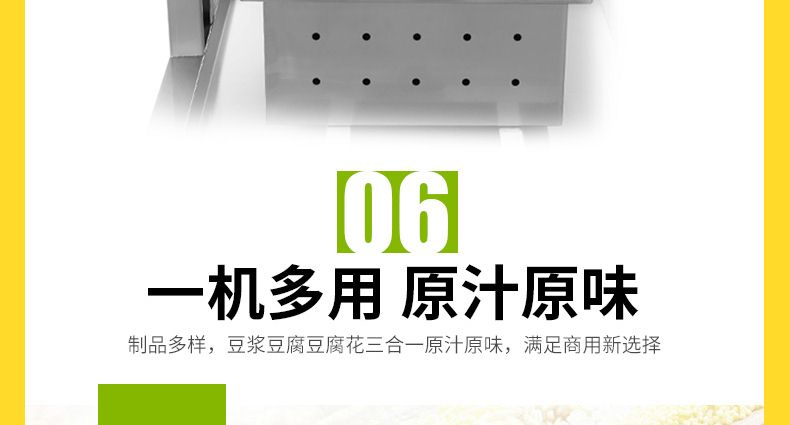 旭眾智能豆腐機專業(yè)生產(chǎn)數(shù)種豆?jié){制品,穩(wěn)定高效,采用磨漿分離機和煮漿機,出品率高于其它設(shè)備,擁有自動控制系統(tǒng),還增加數(shù)碼溫度控制儀,對煮漿隨時進行監(jiān)控,同時對不同產(chǎn)品所需溫度自行設(shè)定,當(dāng)煮漿達到設(shè)定溫度時,具有自動提示及報警功能;整機采用不銹鋼材質(zhì)制作,質(zhì)量卓越,占地面積小,安裝簡單,工藝先進,一臺設(shè)備只需一人操作,省時、省力、省工。
