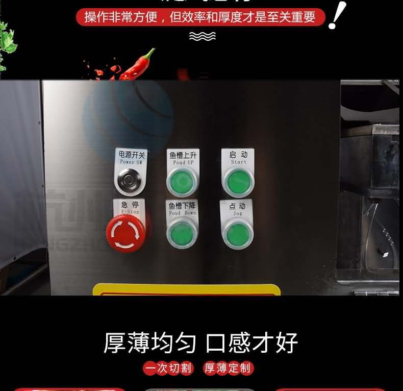 斜度及厚薄默認標準為35°、2.5毫米,斜度有(25°、30°、35°、40°、45°)可供選擇定制,厚度可從1.8毫米到10毫米范圍定制,定好規(guī)格不能調(diào)整,不能更換。斜度越小,魚片越寬。