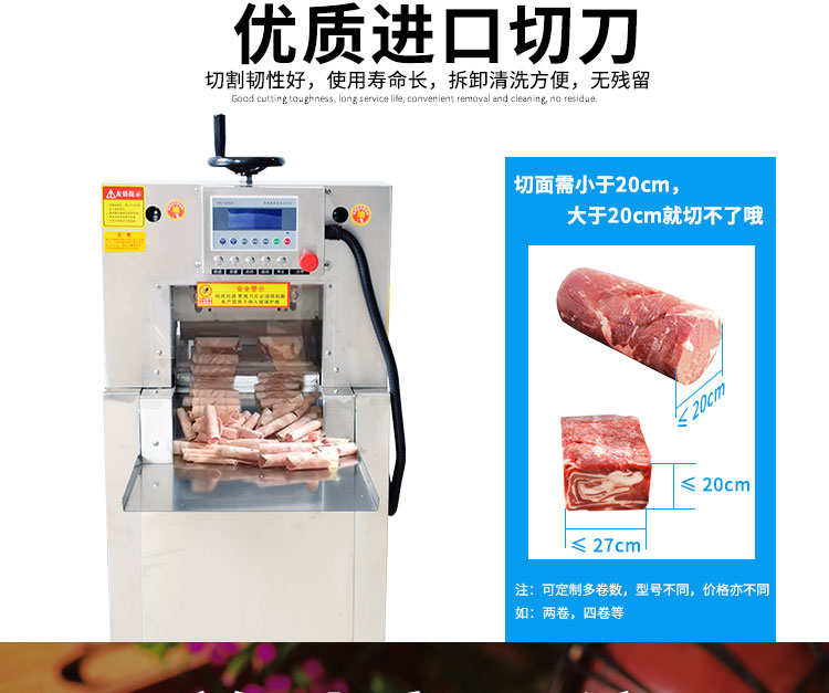 4.自動化程度高,肉片切制,厚度調(diào)節(jié)。肉卷輸送,自動停機。均可一鍵完成,省工省時