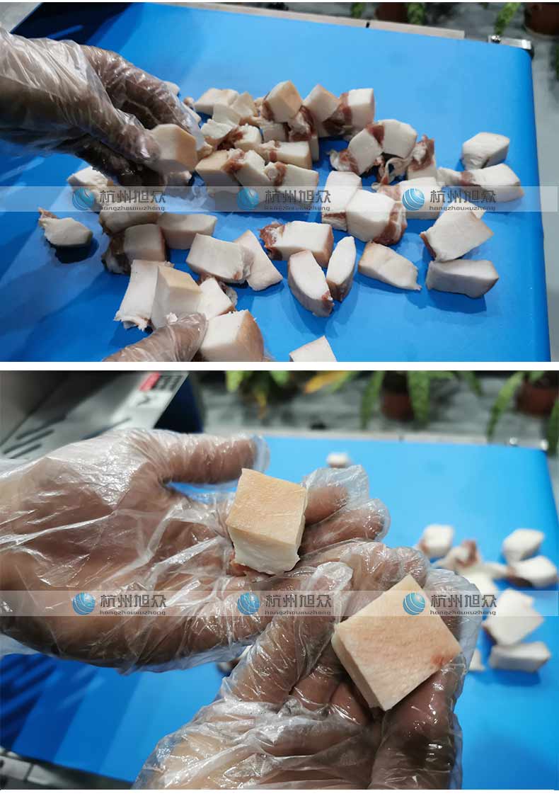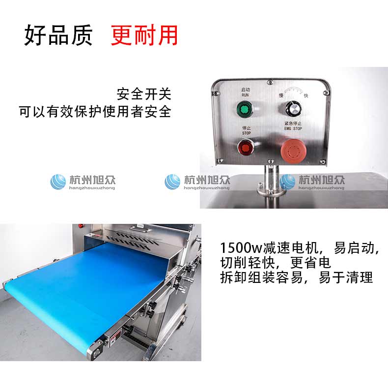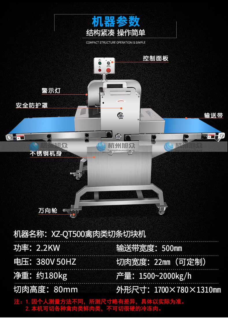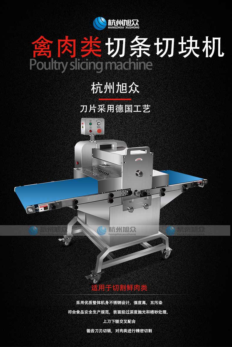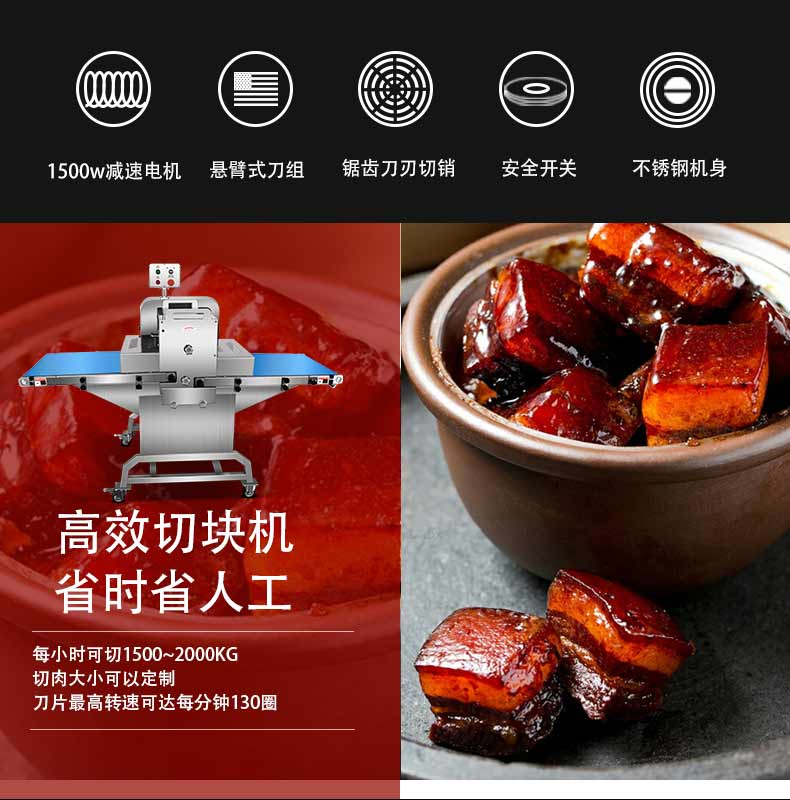 采用優(yōu)質(zhì)不銹鋼整體機(jī)身設(shè)計(jì),強(qiáng)度高,無(wú)污染,符合食品安全生產(chǎn)規(guī)范 表面經(jīng)過深度拋光和噴砂處理,外表光滑,易于清理 上刀下輥交叉配合,鋸齒刀刃切削,對(duì)肉類進(jìn)行精密切割, 保證食材切面平整,品質(zhì)如一。 安全開關(guān),可有效地保護(hù)使用者的安全。 懸臂式刀組,可輕易拆卸、清洗,不同規(guī)格的刀組更換便捷。 工作效率高,產(chǎn)量大。 速度快,效率高。 1500W 減速電機(jī)電機(jī),易啟動(dòng),扭矩大,切削輕快,更省電。 拆卸組裝容易,易于清理。 適用于各種禽肉類切條切塊。