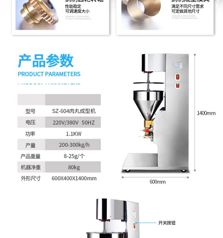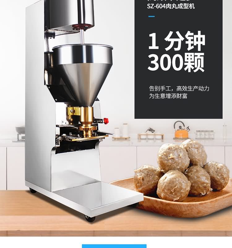 SZ-604肉丸成型機(jī),肉丸成型機(jī)采用不銹鋼材質(zhì),丸子直徑可達(dá)15-35mm,可以制作各類爽脆,有韌性、有彈性的豬肉丸、魚丸、牛肉丸、貢丸、雞肉丸等