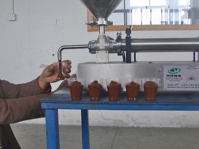 定量灌裝豆瓣醬選半自動醬類灌裝機,專業(yè)灌裝帶顆粒醬類食品,辣椒醬灌裝機效果如圖所示: