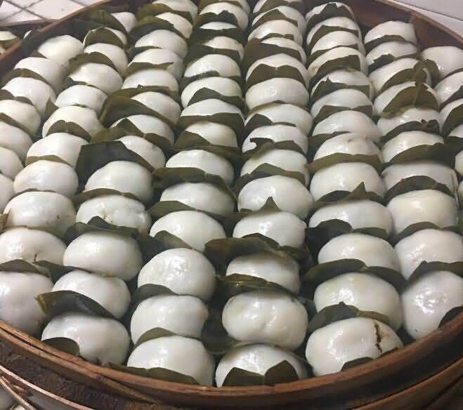 二、有餡豬兒粑:把糯米粉和好搓成團,拿出少許搓成乒乓球樣大小的圓形,在中間捏上一個小小的窩,把餡兒放進去,再封口捏好,做成略像小豬形狀或橢圓的即可,用菜葉包上,然后把“豬兒粑”放在蒸格里。