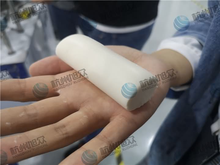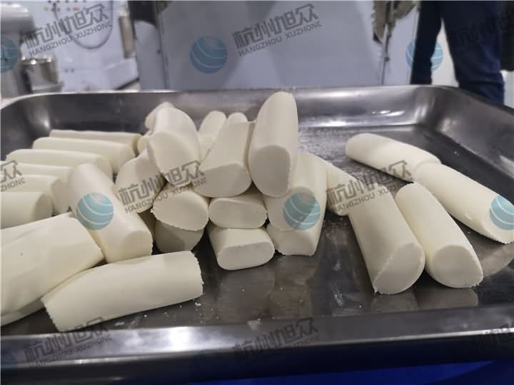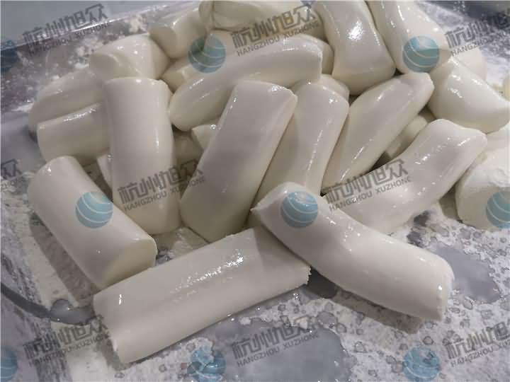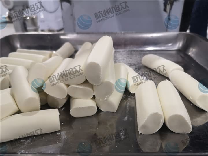 做芋圓啦!不過今天的客戶從山東不遠(yuǎn)千里來到杭州旭眾,因?yàn)樗麄冏约河性谧鲇髨A,有著自己獨(dú)有的芋圓工藝技術(shù),所以前期的工作都是他們的人員加工揉面成團(tuán),再通過芋圓機(jī)切割成他們想要的規(guī)格,由剛開始出兩孔的小芋圓變成單孔的大芋圓,也不知道他們的原料是什么,聞起來有一股奶糖的味道很香,那我們來看看芋圓機(jī)做出來的芋圓效果: