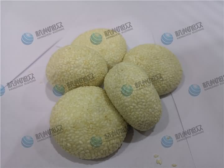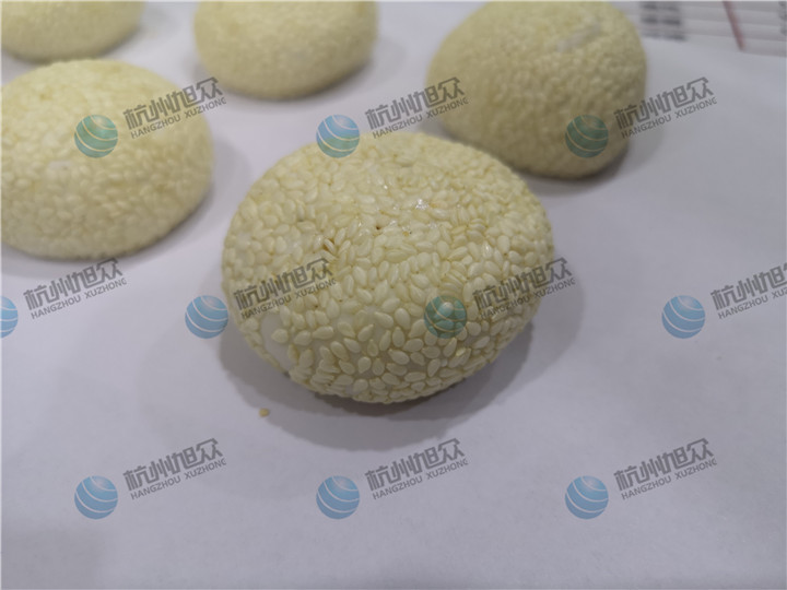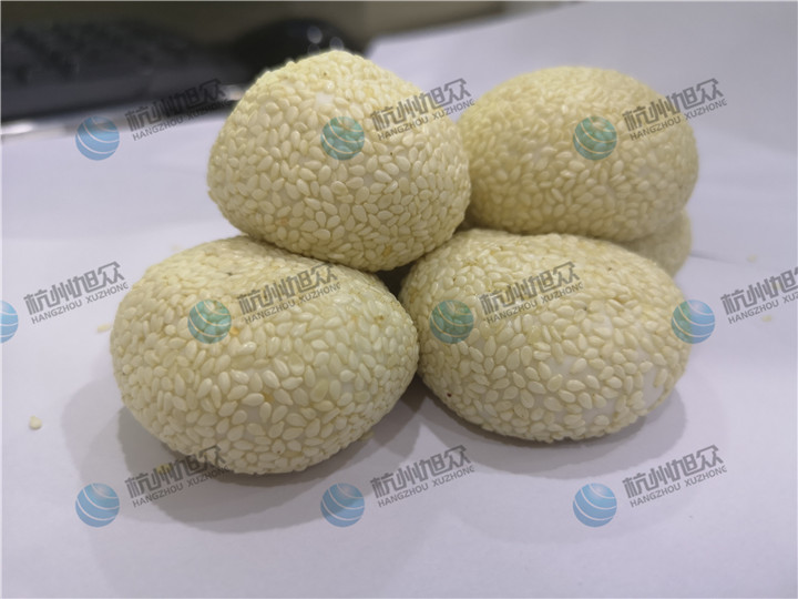 包餡機(jī)做出來的麻球就是這么一個(gè)光溜溜的麻球,克重大概48g左右,皮在46g,芝麻餡占非常小的比例,然后客戶還要裹白芝麻外衣,不可裹粉機(jī)目前沒有樣機(jī),試不了于是采用了人工去給它們裹上白芝麻的效果如下圖: