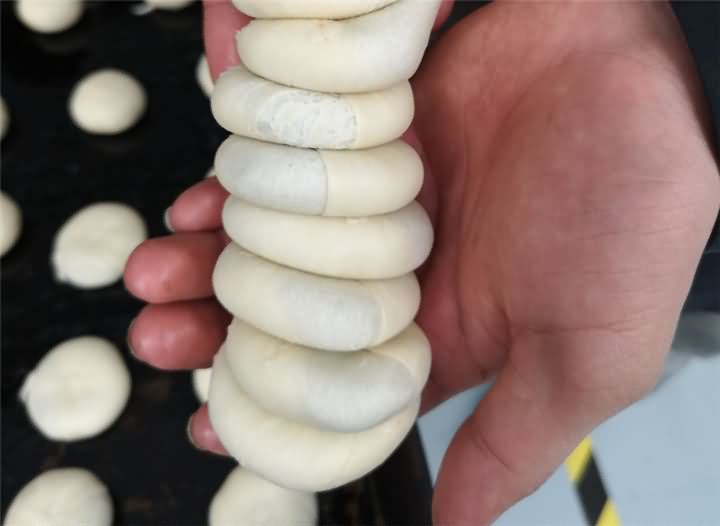 今日需求酥餅機(jī)的客戶要做的豆沙餡酥餅,因?yàn)楫a(chǎn)量高,員工也多,但是難免會有些突發(fā)意外出現(xiàn)導(dǎo)致生產(chǎn)量斷斷續(xù)續(xù),導(dǎo)致動不動要求加班加點(diǎn)趕產(chǎn)量,產(chǎn)量趕上了員工的那邊就會有意見了,于是來到現(xiàn)場只要求看酥餅機(jī)能自動包豆沙餡成型的效果: