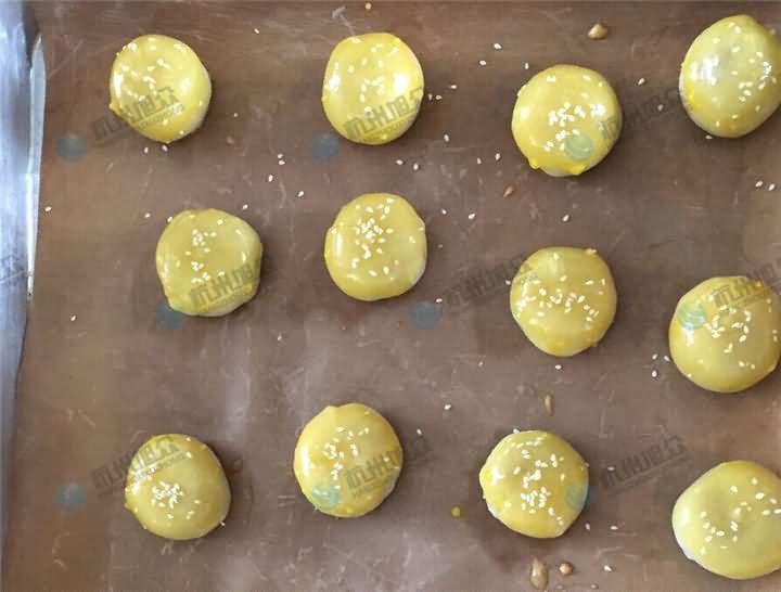 7, 最后收口朝下即成了蛋黃酥,一次做好12個,刷上蛋黃液再撒上少量黑芝麻,進190度預熱預熱好的烤箱烘烤30分鐘左右,看到蛋黃酥表面金黃,香氣撲鼻就可以出爐了。
