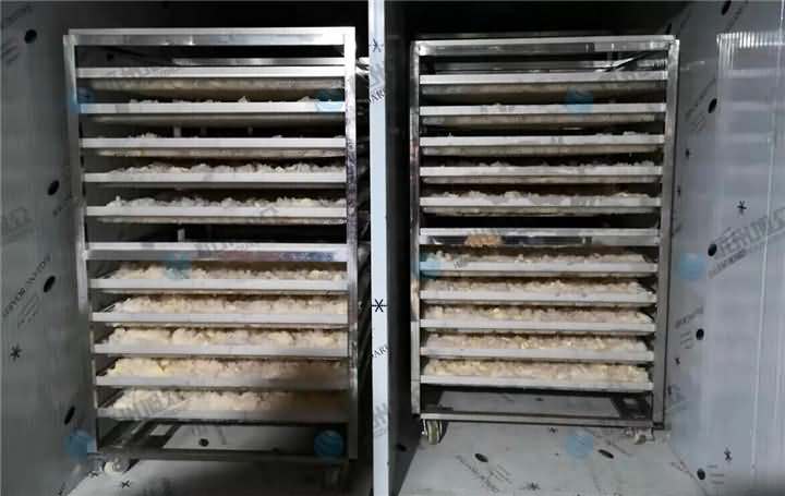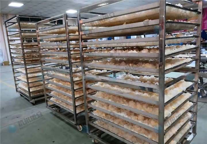 將浸泡洗凈的銀耳,耳花朝天,一朵朵地排放于烘干篩上,烘干篩可以采用不銹鋼焊制或者篩盤(pán)上下重疊堆放在一起,一般擺十幾篩盤(pán),等稍微滴干水之后,再擺放到帶萬(wàn)向輪不銹鋼推車(chē)上,整車(chē)推進(jìn)烘干房