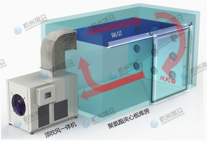 頂吹風一體與側(cè)吹一體原理是一樣的,只不過頂吹的回風口和出風口是通過風管連接到烘房,而且頂吹的出風口安裝有風機,其熱能不依賴風機墻來帶出熱能。