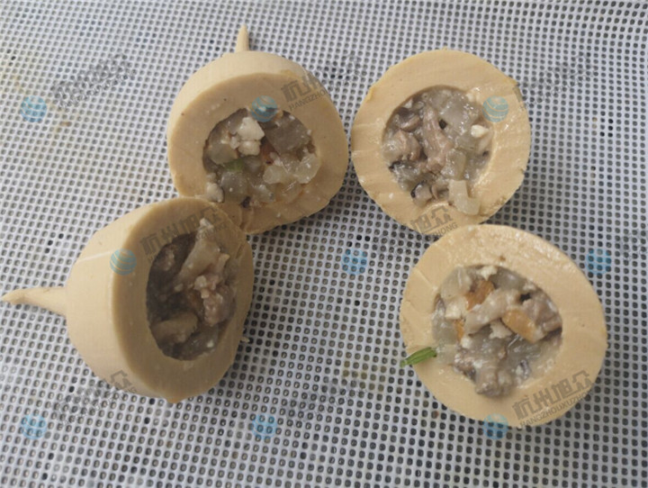 步驟三:餡料用攪拌機攪拌好后放入包子機餡斗中,和好的面團放入包子機面斗中,調(diào)整好面皮克重后再充餡,批量生產(chǎn)地瓜包: