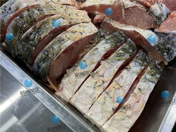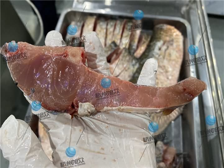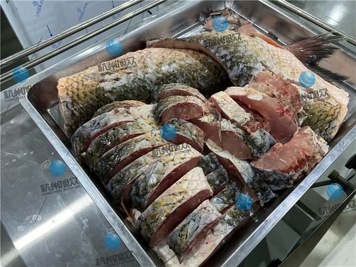 草魚剁塊選擇XZW-130禽肉類剁塊機(jī),該剁塊機(jī)專業(yè)剁帶骨肉類食品,但除了大骨、豬蹄以外。禽肉類剁塊機(jī)分為丁刀組和單刀組,丁刀組剁的是方塊形,而單刀組則是直接塊,丁刀組對(duì)于物料要求高,需要物料冷凍后剁塊效果才明顯,就好比如雞架,如若直接將新鮮的雞架通過禽肉類剁塊機(jī)剁塊,那就會(huì)產(chǎn)生嚴(yán)重的連刀現(xiàn)象,一個(gè)刀不會(huì)直接切到釘板上,因?yàn)檫@樣釘板很容易報(bào)廢掉,二個(gè)就是雞皮本來就很有韌性,你讓人工去手撕雞皮也得費(fèi)很大的勁,所以如果需要用丁刀組去剁雞塊、鴨塊的話物料要冷凍哦!而單刀組對(duì)于物料的要求就沒有那么高,醬板鴨、鹽水鴨、草魚剁塊用單刀組剁塊效果非常好,那么我們先來看看XZW-130禽肉類剁塊機(jī)剁草魚塊效果:
