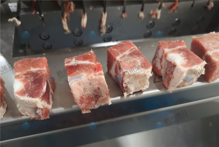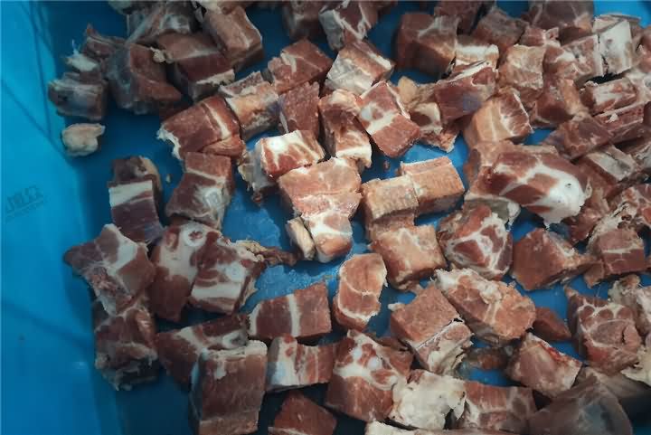 旭眾新款XZW-300魚禽肉類剁塊機可剁微凍過的肉類、禽類、小肋排等。大排、豬蹄、筒骨不建議用剁塊機哦!那么先看看魚禽肉類剁塊機剁肋排塊效果: