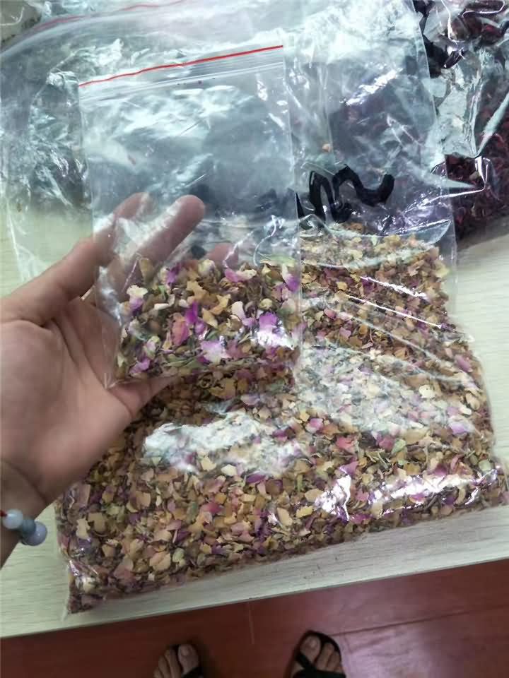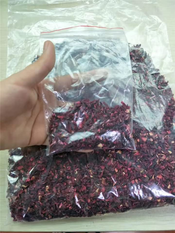 旭眾不銹鋼破碎機(jī)破碎篩網(wǎng)孔徑標(biāo)配6mm或者8mm,另可定制10/12/14/16/18/20/30,一般不定制小于6mm的孔徑,遠(yuǎn)在新疆的劉老板寄了他家烘干好的玫瑰花等物料來到現(xiàn)場,并直觀了用破碎機(jī)破碎后的效果: