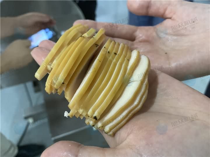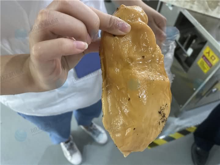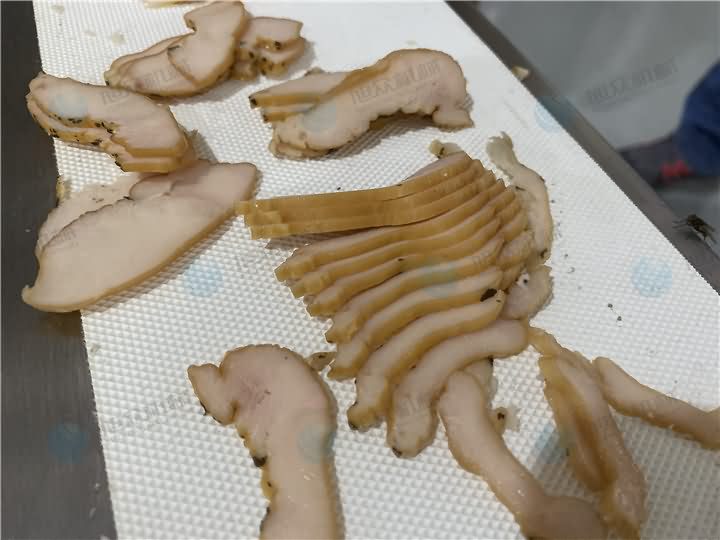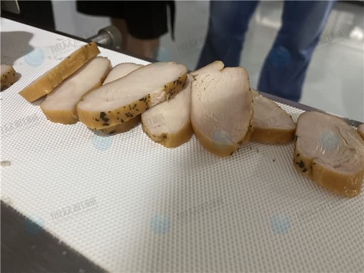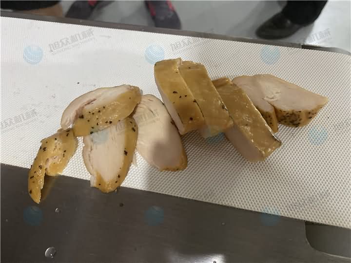 煙熏雞胸切片優(yōu)選熟肉切片機(jī),雞胸加工廠老板網(wǎng)上找到旭眾熟肉切片機(jī),聽(tīng)說(shuō)機(jī)器可以現(xiàn)場(chǎng)演示,帶了好幾包煙熏雞肉來(lái)到現(xiàn)場(chǎng),熟肉切片機(jī)切雞胸肉從10mm→6mm→3mm→2mm不斷演變,最終調(diào)到客戶(hù)滿意的2mm的薄度,當(dāng)場(chǎng)簽定合同直接定購(gòu)熟肉切片機(jī),那么我們來(lái)看看熟肉切片機(jī)切雞胸肉片的效果: