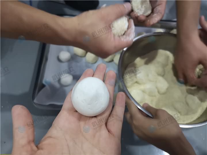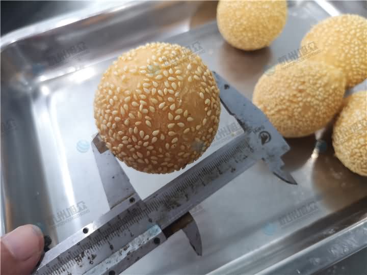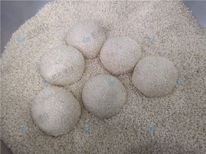 多功能包餡機做麻球咯!就是一開始做出來的團子形狀,如要裹芝麻則需要人工手工裹,或者可以配一臺自動裹粉機器,專門裹粉、裹芝麻、紅米、紫米等等,先來看看包餡機做的麻球效果: