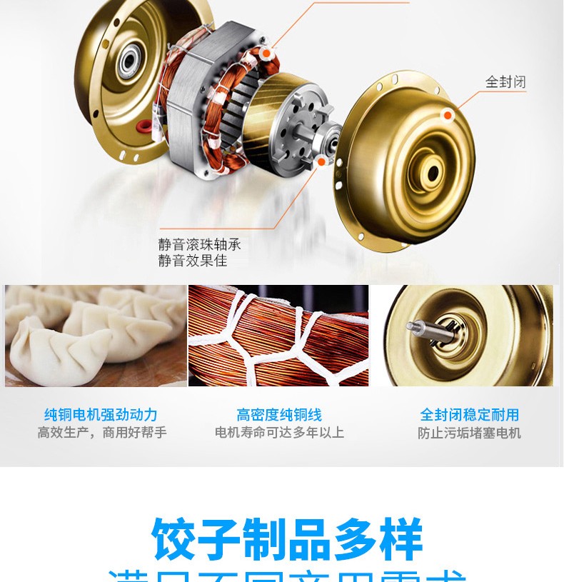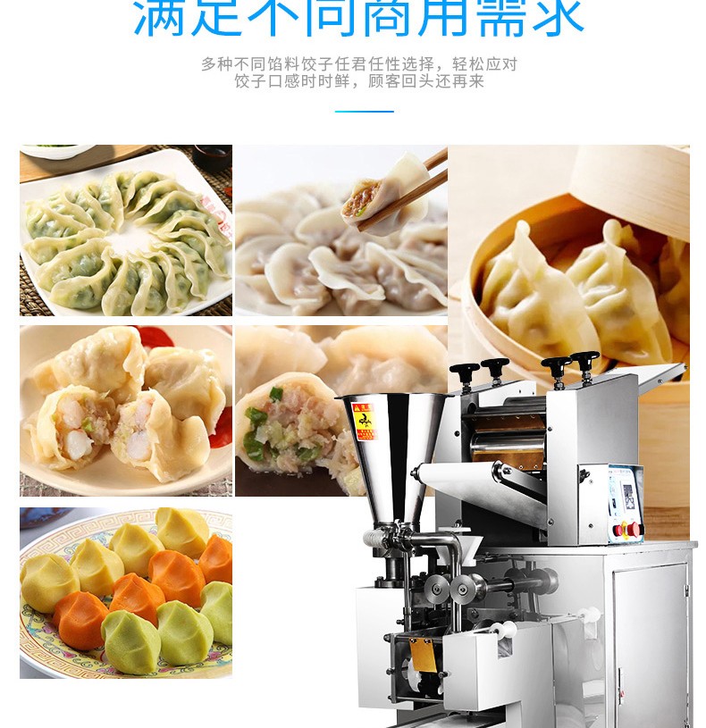 所以全自動餃子機的出現(xiàn),幫助了很多商家解決了這些問題,餃子機包餃子,只需將和好的面,拌好的餡,放入餃子機中,餃子機就會自動搟面自動成型包餃子,一秒一個餃子,0-20000個/小時的產(chǎn)量,速度可調(diào),大小可調(diào),厚薄可調(diào)。這樣好的機器,勸你不要錯過。