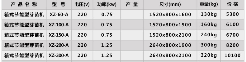 | 型號(hào) | 工作電壓 | 耗水量 | 日耗電(度) | 功率 | 育苗箱 | 重量 | 外形尺寸 |